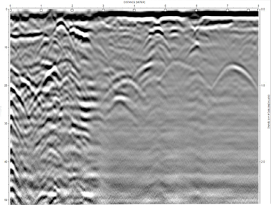 Typical subsurface utilities data showing hyperbolic response from buried pipes, ducts and cables.